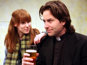 Delightful in the unexpectedness of their portrayals, they also drive the arc of the play. Meg Baumann as Girleen lets the audience glimpse a survivor whose tough-mindedness and infatuation balance each other well under a blunt, foul-mouthed external guise. Baumann brings a gritty level-headedness to her role, and finds the precise, subtle moments in her final scene with Father Welsh to reveal glimpses of the strong woman she will likely become.
