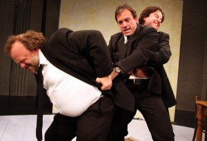 “The murder capital of f***ing Europe”: an overstatement? Hardly so. The play revolves around the vengeful, childish, grotesquely physicalized relationship of two brothers, bound together by blood and habit and the mutual knowledge that one killed their father in a grisly, deliberate act of murder. Coleman and Valene work out their issues as only a pair of guilt-crazed, booze-soaked Irishmen can—by beating the living tar out of one another. In Ireland most likely every wince inducing on stage gut punch and head butt is met with huge guffaws of recognition; it’s how men like these two would relate, in the extreme. Stage West’s audience seems engrossed but baffled, waiting for the ‘funny bits’ to start, unsure where to laugh.