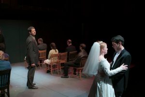The elegant simplicity of the minimalist set design (Clare Floyd DeVries) fosters full attention on acting and script: wooden tables and chairs in wide open thrust space with upstage ‘black boards’ for chalk-drawn windows and the theatre’s second story balcony openings employed for intimate scenes.