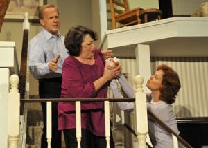When their psychological battle erupted into physical violence, it was hard to believe they were acting and not flying out of control (Matthew Ellis – fight choreography). The male actors floating around these female Oklahoman cyclones were equal to their tasks. City Rep artistic associate Michael Jones created a vibrant portrayal of the patriarch Beverly in the play’s opening scene, foreshadowing the play’s eventualities delicately and simply, without telegraphing them soap opera style. Oklahoma City University professor D. Lance Marsh provided a believable grounded contrast to Logan’s Barbara as her philandering husband Bill. Regional actor, playwright and corporate trainer Rick Allen Lippert was the perfect henpecked husband for Violet’s brassy sister Mattie, played with delightful gaucherie by Cindy Hanska. Equally impressive in their strong performances were regional director and commercial actor Craig Pruitt as incompetent, codependent Little Charles and nationally respected theatre professional Jonathan Beck Reed as sleazy pedophile Steve, delusional youngest sister Karen’s fiancée. Sarah dAngelo brought an impassive strength and calm to her role as Native American housekeeper Johna, and Oklahoma City University senior Brooke Culbertson made a convincing portrait as Barbara’s wayward teen-aged daughter Jean, clearly following in the family traditions of self-deception and substance abuse.