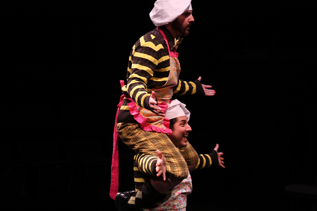 Serrecchia creates palpable stage magic from the moment the show opens in complete darkness, setting its whimsical tone simply, with Man in Chair’s voice. As soon as the lights come up, the stage erupts with circus-like color, banter and energy as the entire company hurtles in, pouring forth from Man in Chair’s imagination. Serrecchia masterfully evokes a kaleidoscope of choreographed but natural-seeming stage pictures and moments and characterizations executed in smoothly orchestrated chaos. Every inch of his stage, on all levels, explodes with fine-tuned mayhem and drive. It feels easy and spontaneous, yet all visual and plot aspects tie lovingly together, joyfully following the arc of the play into the depths of one man’s mind like Niagara Falls in living Technicolor.