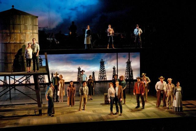 Sybille Pearson and Michael John LaChiusa have created the start of a fascinating, definitive work of musical theatre with Giant, honoring Edna Ferber’s signature novel, described as a “sensational story of power, love, cattle barons, and oil tycoons”. LaChiusa’ score reflects the style, scope and raw energy of the Texas plains and wildcatter lifestyle with gritty lyrical abandon while remaining decidedly contemporary in compositional style. Orchestrations, by Bruce Coughlin, are spot on tight and balanced. Musical director/conductor Chris Fenwick weaves magic with his splendid orchestra floating in surreal sprawl above the stage action, partly masked by a cloud-painted scrim. As for the book: so much of the novel’s detail gets jammed in with rapid transitions, the show becomes jerky, hard to follow. It presents (in two acts) about six hours’ worth of information in three hours and needs a firm edit to whittle it down to a manageable two hours’ worth of entertainment. Act I kicks in hard at first, then meanders around the back forty with a jumble of seventeen musical numbers. I became awfully aware of my “new and improved but still uncomfortable” Wyly Theatre seat, which means the stage action didn’t hold my attention. Intermission was pure relief for a numb backside. Act II, with more melodic tunes in ten coherent musical numbers, rounds up the strays and heads ‘em down the arroyo at a breezier trot. Yeehaw.