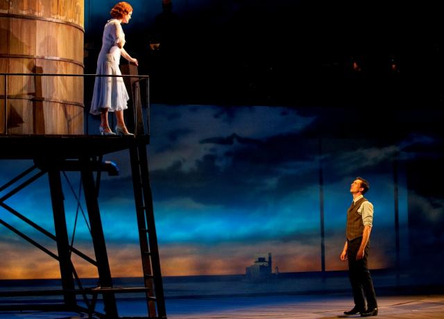 The set (designed by OBIE winning Allen Moyer) is a joy to behold, exquisite use of the Wyly Theatre space. The rustic, life-sized water tower dominating center stage right sets the rural tone and doubles as a balcony for courting scenes. Center stage left a broad staircase with Tara-like banisters heading up and off adds elegance to “indoors” scenes. Behind all scenic furnishings and props that float on and off stretches a non-ending prairie horizon beneath the cloud-painted scrim. Oil derricks appear as the play shifts focus from cattle to oil. Color floods the environment: natural, sunset-hued, sand-burnished, husky in shadow, relentlessly bright in mid-day heat, delectable (Kenneth Posner).
