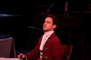 and a pensive, exquisitely voiced performance of “Mama, Look Sharp” by Max Swarner as the exhausted Courier on an almost bare stage while Congress is in recess. Act Two’s standout song, “Molasses to Rum”, in which South Carolina’s Edward Rutledge excoriates the northern colony representatives for their hypocritical profiteering from slavery with near operatic rage failed to achieve anticipated impact. Sung by the supremely talented Kyle Cotton (breathtaking as Jud in Lyric’s recent “Oklahoma!”), his voice seemed overpowered by the orchestra’s volume and oddly distorted on mic. The sense of his words got lost. Technical adjustments should sort out the problem so Cotton’s talents can carry the vocally demanding, socially relevant number home. Suspense builds with palpable tension as Denson intensifies her able cast’s onstage depiction of the considerable strife leading to the show’s culminating peak. A scrim softly drops before the final scene as each man signs the “treasonous” document when the secretary calls his name. They freeze behind the scrim, carefully assembled in the famous tableau painted by John Trumbull. The audience surges to its feet, cheering and clapping, in celebration of the delightful performance and honor of the historic opportunity these rebellious men created. If only today’s Congress would live up to that promise. E pluribus unum. Ad astra per aspera.