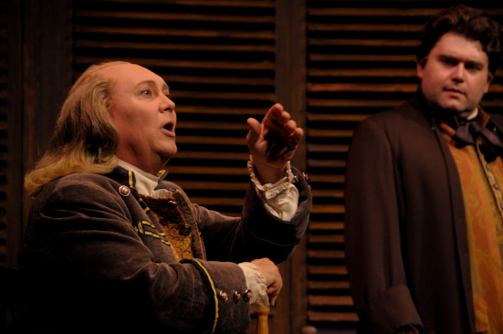 Not a show particularly memorable for its music, there are long stretches of nothing but sparring, bickering and cajoling. Due to the strength of its cast, led by supremely confident, clarion-voiced Brian Gonzales as John Adams and the masterful comic presence of David Coffee as avuncular, wise-cracking Dr. Franklin, the show hits as true and compelling a note as everything else Lyric Stage has mounted this year. Director Cheryl Denson uses Kevin Rupnik’s imposing, historically evocative “thrust within a proscenium” angled set to best advantage. The audience senses the heat in the Congress’ claustrophobically crowded meeting room as the men preen and parry, or slump in resigned, enforced contemplation. Apron areas down right or left of the central massive wooden set piece allow the solos or private interactions to resonate effectively.