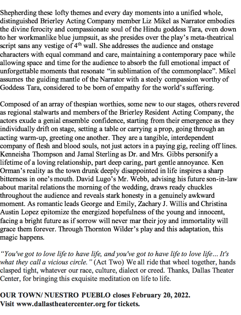 Our Town/Nuestro Pueblo/Amar La Vida This entry was posted on 19 February 2022, in Theatre Reviews. Bookmark the permalink. Leave a comment Share this:TwitterFacebookLinkedInPinterestTumblrEmailLike this:Like Loading... Related