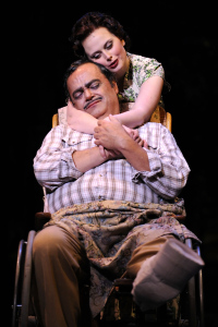 Amber Nicole Guest as romantic lead Rosabella immediately follows, revealing her character’s heart’s desire with angelic lyricism and an amazing vocal range, delivering the complex “Somebody, Somewhere” as easily as a nursery song. Hard to tell if the audience is more in love or in awe of her. One by one the leads enter, each enlivening the difficult, elaborate score with comprehensive vocal talent and superior acting chops. Audience appreciation mounts to an almost audible hum: basking in the dark, sultry glow of Doug Carpenter as vineyard foreman Joe; eating up the sunny charm and wacky antics of Alex Organ as Cleo’s sweet, ingenuous boyfriend Herman; or shedding a tear in amazement at the boundless expressive capacity and engaging warmth of longtime professional Bill Nolte, who as Tony carries the full emotional arc of the play’s plot on confident, creative shoulders.