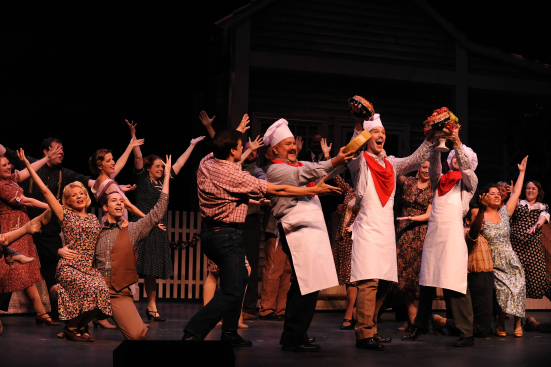 With a chorus that never blunders a dance step or sings a false note, Denson, Dias and Pfluger’s direction styles blend smoothly to evoke the simpler, sleepier world of a 1920’s Napa Valley vineyard, while keeping the production sharply defined for today’s audience tastes. Minor to the story arc but of particularly charismatic theatricality and adored by the audience is the trio of Italian chefs, Giuseppe, Ciccio and Pasquale. Expertly harmonized and danced by Max Swarner, Martin Antonio Guerra and Tyler Donahue, this trio adds festive “brio” to the production. Scenic design by Michael Anania (originally created for New York City Opera’s 2006 production) conveys the lush, verdant feel of the Napa Valley, and Julie N. Simmons’ lighting design catches the perfect ethereal glow of the region. Costumed in contrasting bright or muted styles and hues for city and country-folk, Drenda Lewis’ costume design helps maintain the sweeping, pastoral sense of Frank Loesser’s most happy musical theatre work.