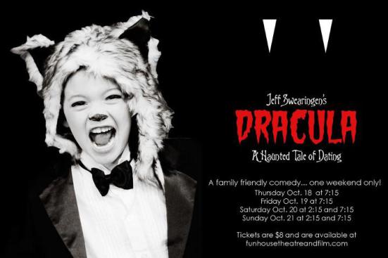 Leads exude well-rehearsed ease and confidence in on stage delivery and characterization not always evident in adult “professional” performances: Jasper Murphy (Jonathan), Riley Flores (Mina), David Allen Norton (Dracula), Marisa Mendoza (Lucy), Alex Duva (Renfield), Doak Rapp (Van Helsing). The supporting ensemble works smoothly together, with each member shining brightly in his or her special stage moment. This cast fully supports each other, comprehends the script and trusts playwright/ director Jeff Swearingen implicitly. Nobody else achieves this superior a level of theatrical veracity in children’s theatre in the metroplex. Joseph Cummings’ romantic, period-hinting set reflects an earthy, storybook-like charm and provides imaginative backdrop for the simple proscenium space. Costumes reinforce characters’ actions and moods or enhance the parody motif in keeping with the script’s intentionally florid style (costume mistress - Bren Rapp). It’s a short run. Fire up your broomstick or hitch that pumpkin coach and four and get there before its goose is long past cooked. Irreverent, but family friendly. Will sell out.