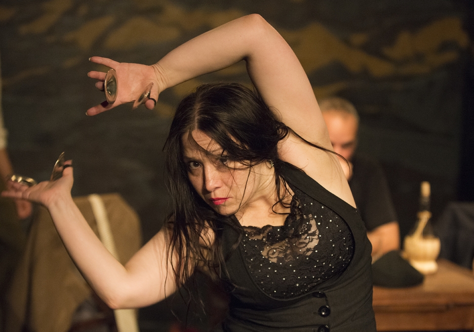 Virgin and whore, Mother of all things Godly, including castanets. Mesmerizing explosions of Flamenco dancing erupted with emotional content as full of expressive passion and musical rhythms as any Puccini opera. Accompanying and punctuating the performance stage left in full view were Cantaor Jose Cortes Fernandez, with a rich, silken voice sure to please the Gods on Mt. Olympus, melodic Guitarrista Calvin Hazen and rhythmically dominant Cajon on percussion, Bobby Fajardo. Following “plot” became insignificant as the dancers’ performance swept the stage. Sometimes the clownish antics of the three drunken chums charmed and amused. More often the love quarrels and courtship rituals expressed deeply and profoundly by master Flamenco artists Arrebola and Duse left the audience entranced and breathless. They were balletic, ageless, euphoric, divine, in balance with the universe while at war with each other. Brazen, earthy mortals blessed with terpsichorean transcendence. Who needs words when dance expresses so much? I didn’t give a fig for the story, either.