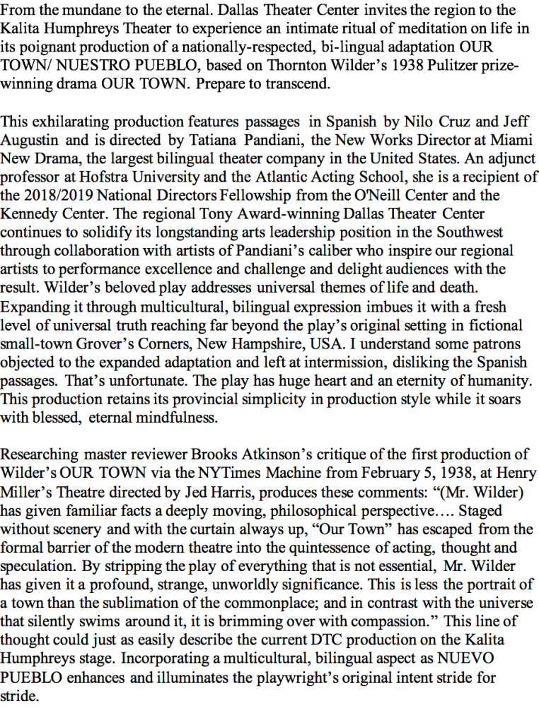 Our Town/Nuestro Pueblo/Amar La Vida This entry was posted on 19 February 2022, in Theatre Reviews. Bookmark the permalink. Leave a comment Share this:TwitterFacebookLinkedInPinterestTumblrEmailLike this:Like Loading... Related